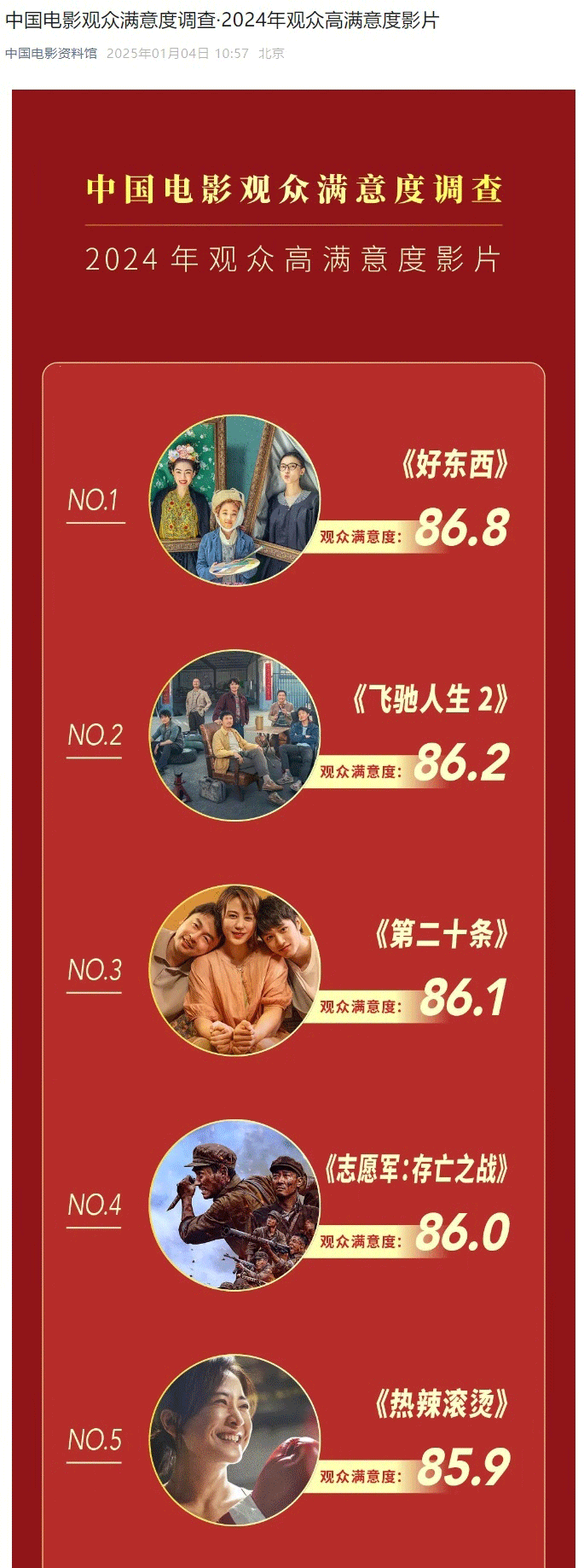 据中国电影艺术筹议中心,中国电影不雅众欢叫度访谒效果出炉,共有25部影片参加2024年不雅众高欢叫度影片榜单。