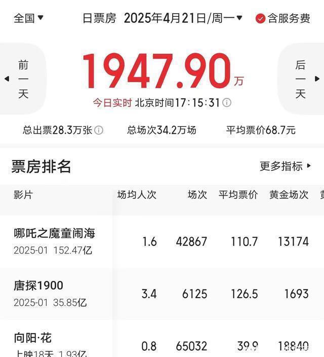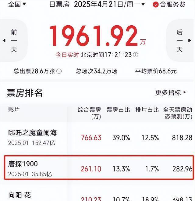 《唐探1900》平均票价大涨到126元东说念主民币,单日票房竣事逆跌,重夺日亚。 上个周末,在咱们国内还是上映了八十多天的春节档老片《哪吒2》,破天瘠土连夺两天日冠,并以近3000万东说念主民币的收得回胜投降了上映仅半个月的《晨曦花》,拿下了中国的周冠。之是以会有如斯兴盛发生,主要即是因为《哪吒2》的日平均票价比较往时大涨了不少。 到了这周,不祥是为了能够再次跟上《哪吒2》的门径,《唐探1900》的日平均票价更是成倍的增长。 据国内的电影平台所显现,在4月21日周一这一天,《唐探1900》的平均票价高出了126元东说念主民币,这险些刷新了中国单片的最高日平均票价记录。