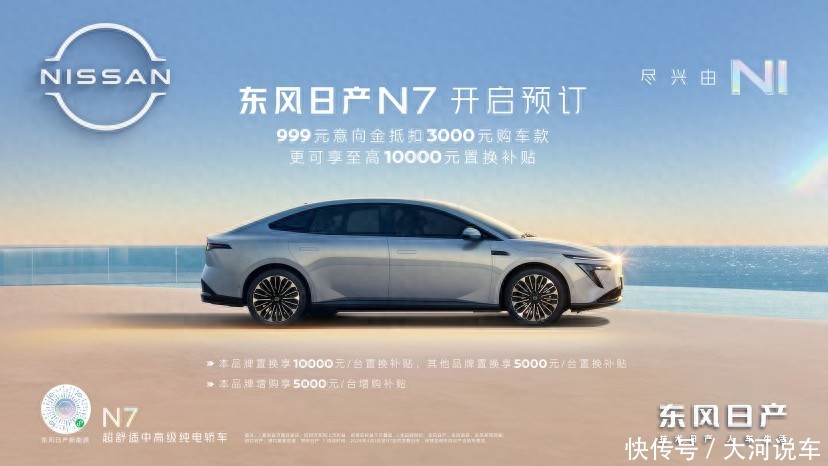 4月13日,东风日产首款纯电家轿N7世界开启预售,预售时分订车可享999元意向金抵扣3000元购车金;本品牌置换享10000元补贴;其他品牌置换享5000元补贴;本品牌增购享5000元补贴。