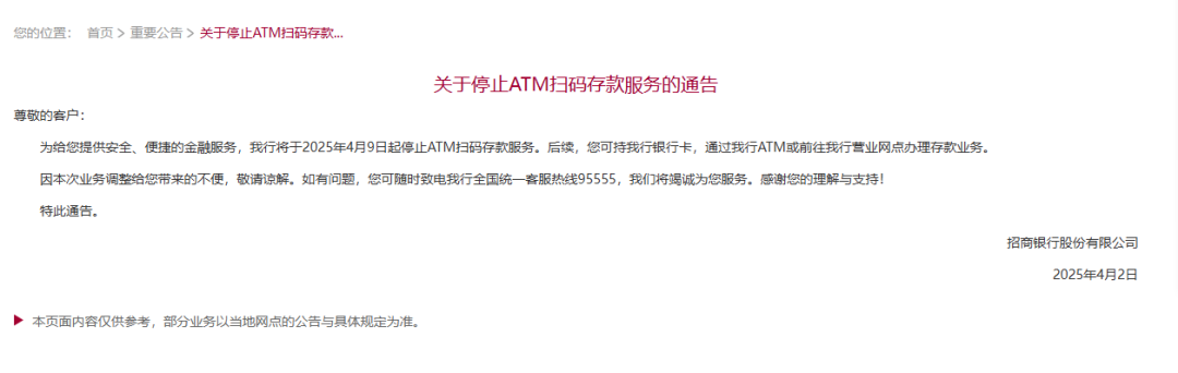 近日,招商银行(600036)发布公告称,将于4月9日起罢手ATM扫码入款干事。后续,客户可合手银行卡,通过招商银行ATM或前去该行营业网点办理入款业务。