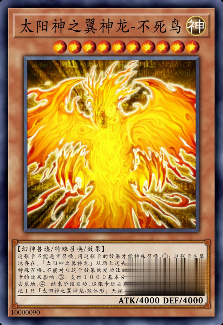 全抗怪兽当中有七大10星怪兽,排在第一位的就是太阳神之翼神龙的不死鸟方式。别看动漫当中,翼神龙在内的三幻神怪兽卡是具有多种成果的单一卡片,但是动漫的许多成果跟设定齐被缔造成了单独的卡片,太阳神之翼神龙就是如斯,不只单有常态,还有蛋方式跟不死鸟方式。
