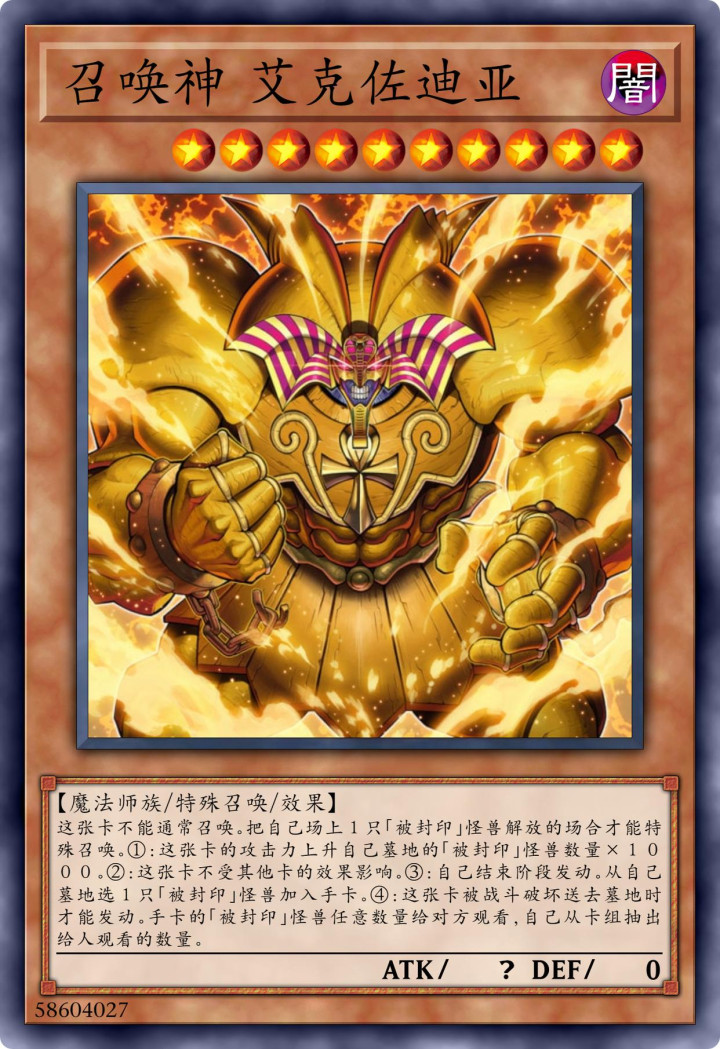 召唤神艾克佐迪亚,恰是其繁衍怪兽之一,流毒力亦然凭证“被封印”字样的同族怪兽数目来定的,而其基于自身的不受其余卡成果影响的才调,亦然其庞杂的推崇之一。
