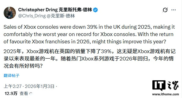 这一论断来自《TheGameBusiness》杂志的克里斯・德林。据他报说念,英国Xbox主机销量暴跌39%,“毫无悬念地创下历史最差年度记载”。比较之下,同时索尼PS5游戏机在英国的销量降幅约为12%。