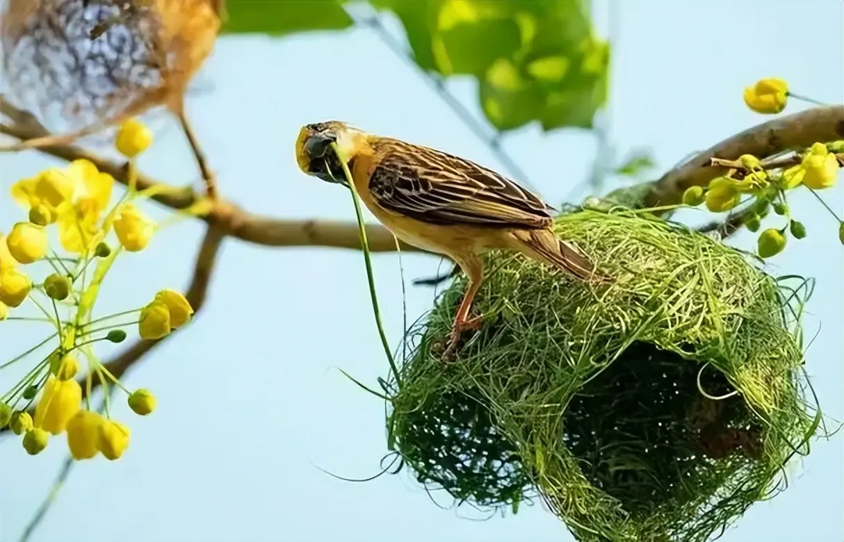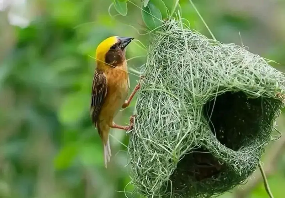 最典型的等于织布鸟。这种生活在非洲和亚洲的袖珍鸟类,会用草茎编织出一个吊挂式的阻塞球形巢,进口开在底部或侧面,十足不朝上。雨水根底进不去,号称"豪华防雨别墅"。